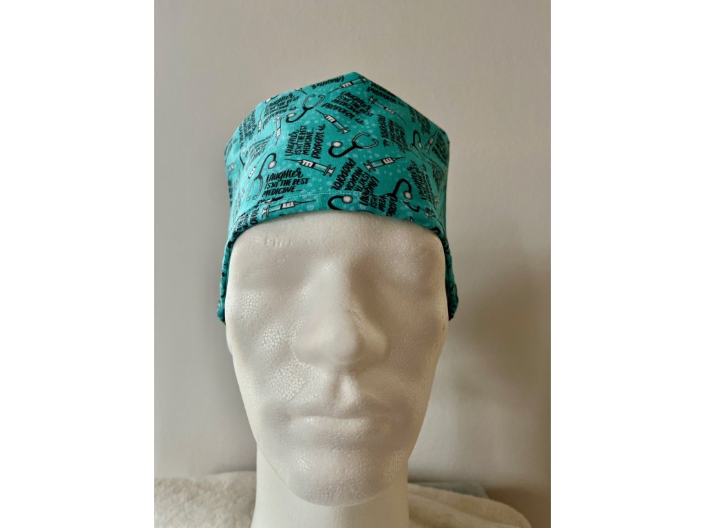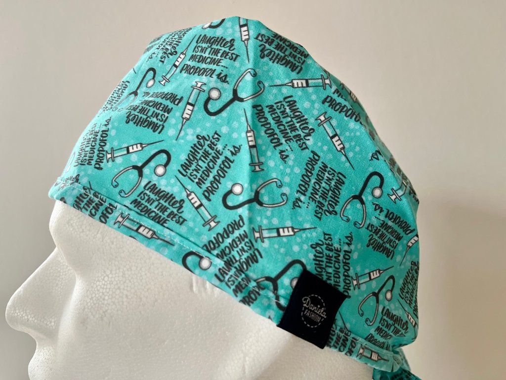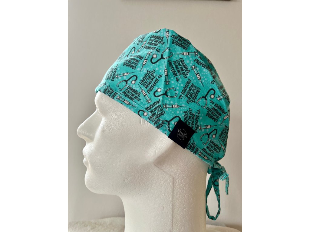 Operační čepice je vyrobena z kvalitní 100 % pevné bavlny s motivem injekčních stříkaček, fonendoskopu a propofolu.