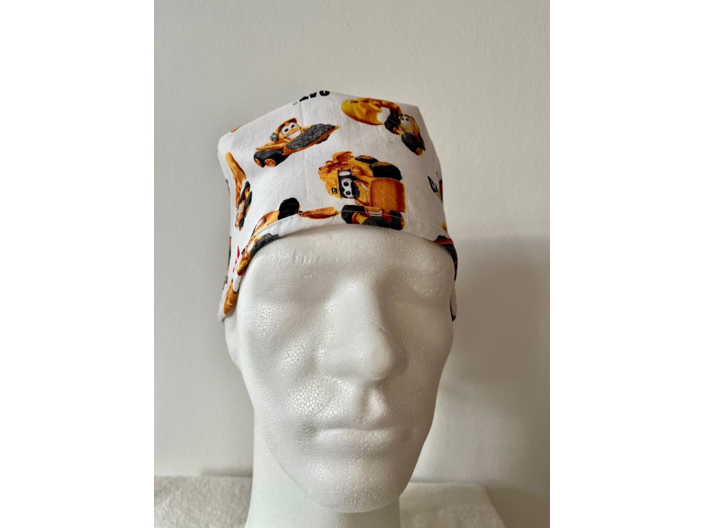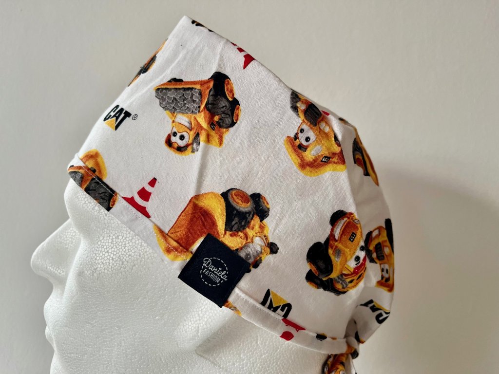 Operační čepice je vyrobena z kvalitní 100 % bavlny s motivem bagrů na bílém pozadí.