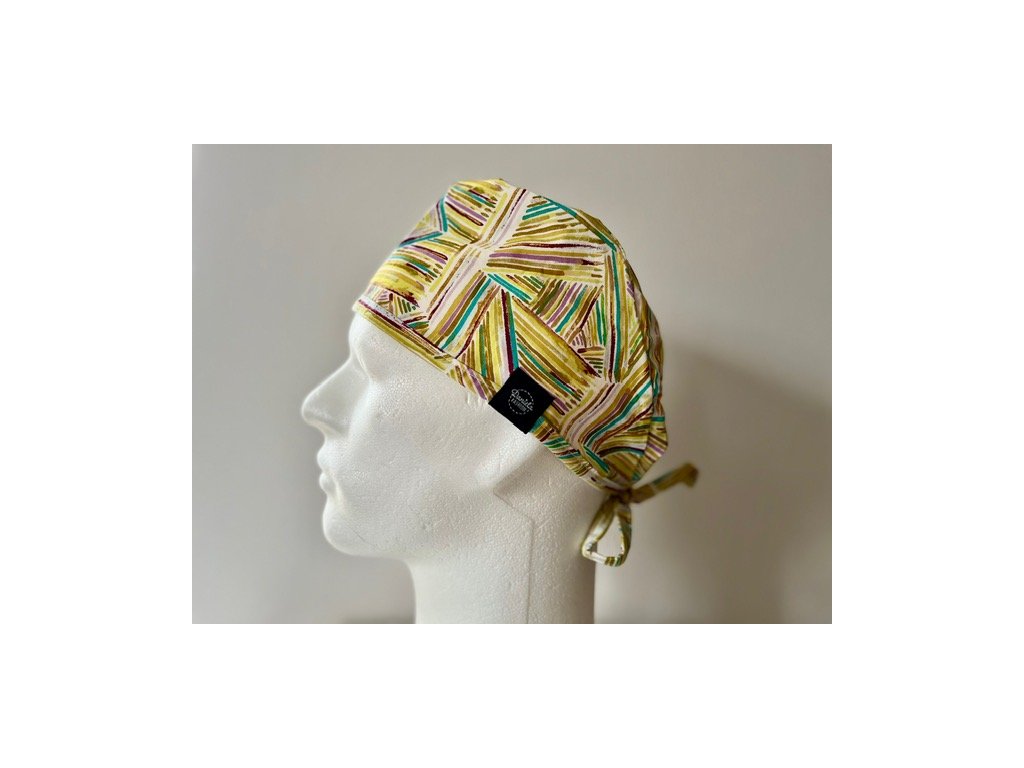 Operační čepice je vyrobena z kvalitní 100 % bavlny s motivem béžových čar.