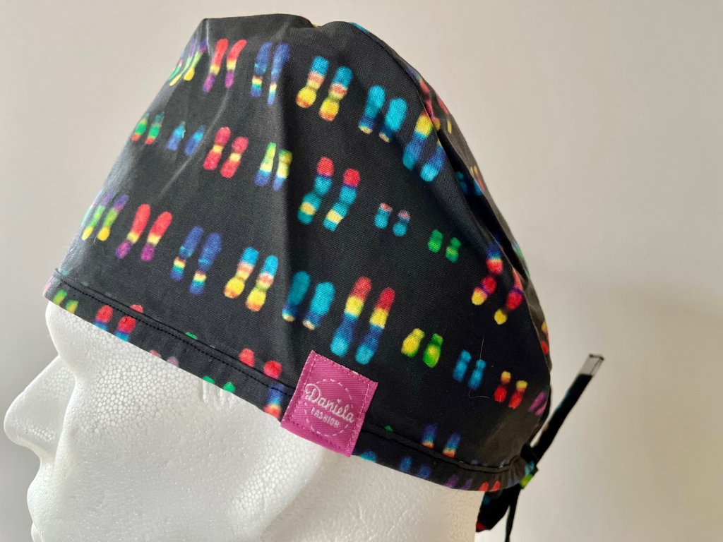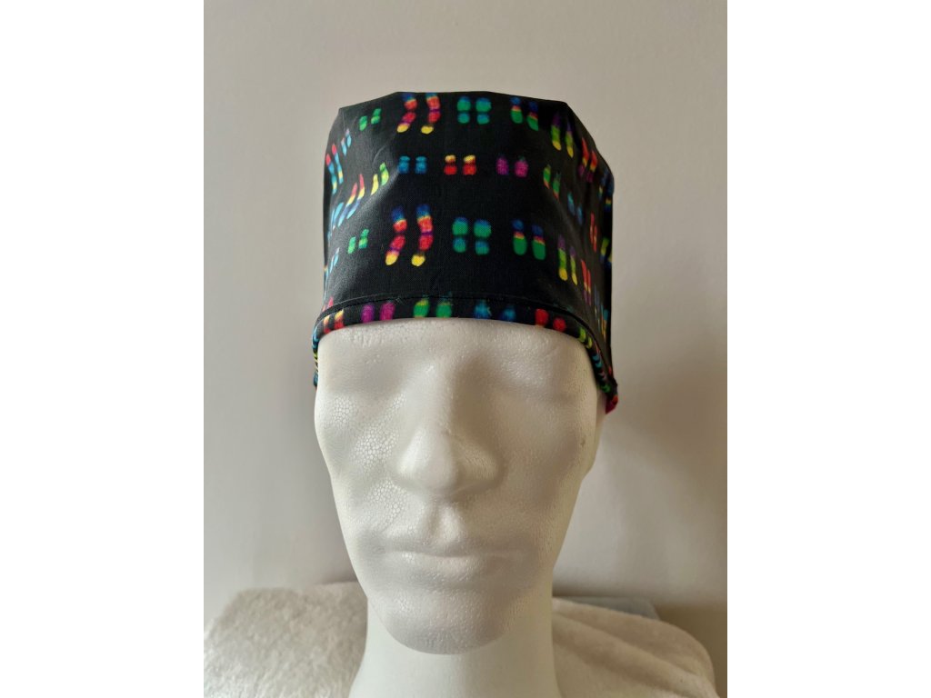 Operační čepice je vyrobena z kvalitní 100 % pevné bavlny. S motivem barevných chromozomů na černém pozadí.