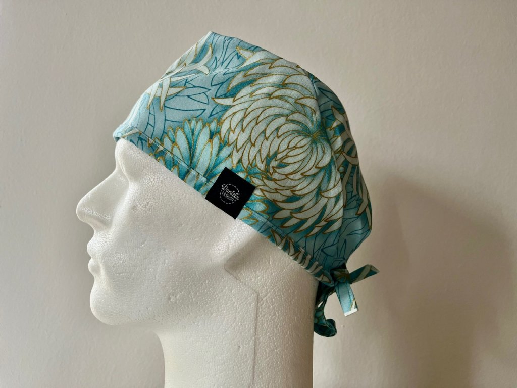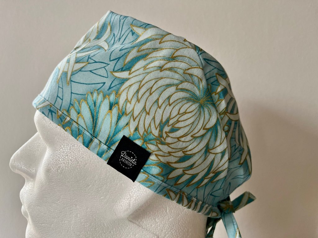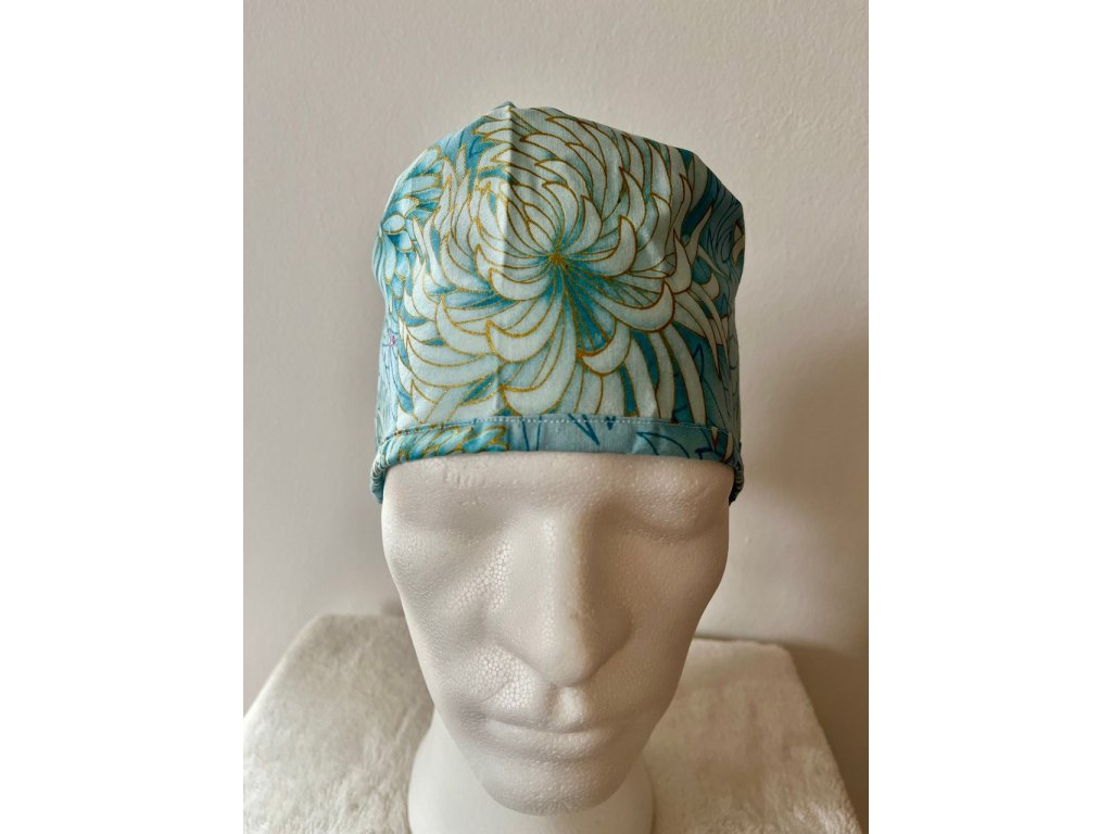Operační čepice je vyrobena z kvalitní 100 % bavlny s motivem modro-bílých chryzantém, lemovaných zlatou linkou.