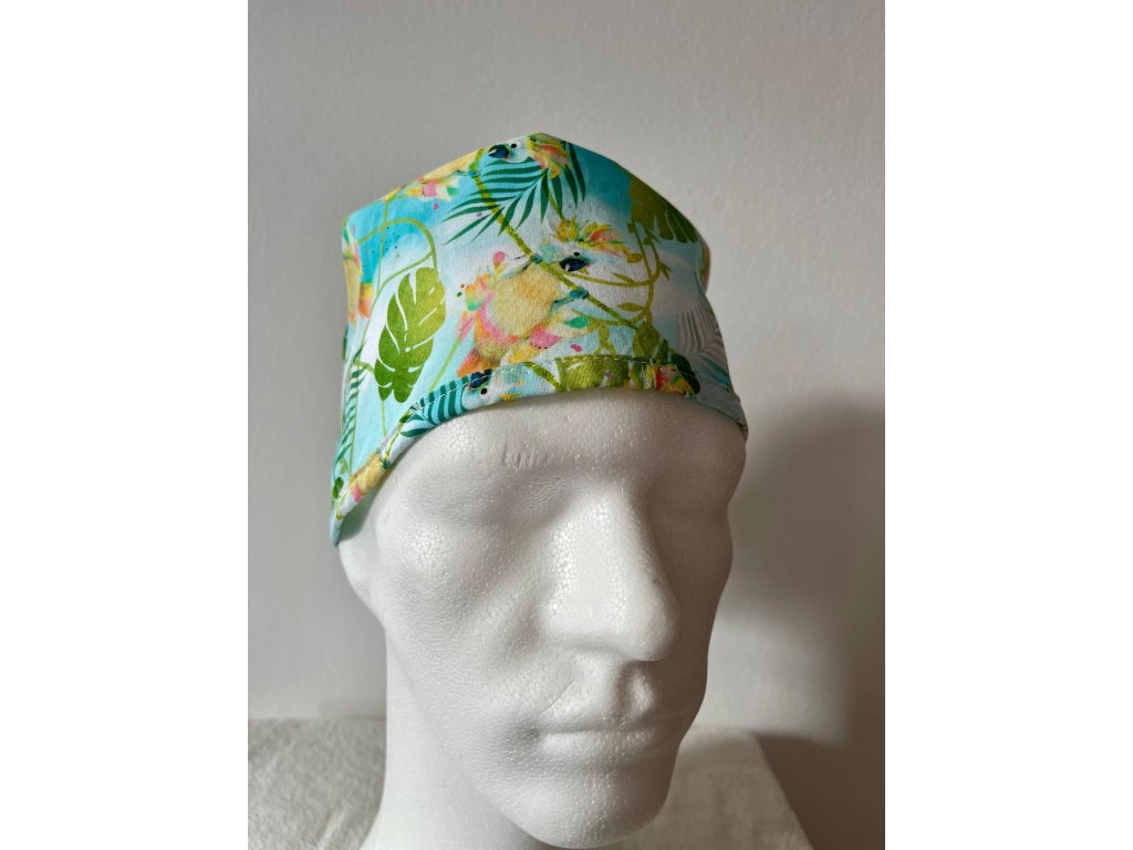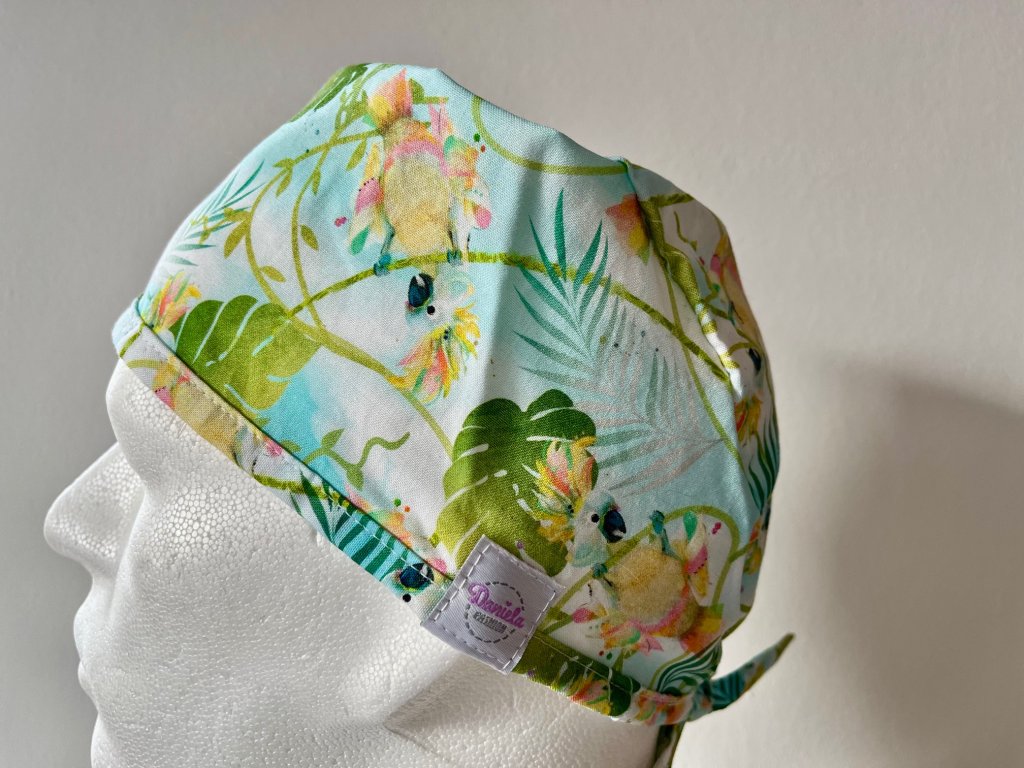 Operační čepice je vyrobena z kvalitní 100 % bavlny s motivem papoušků v modro-zeleném provedení.