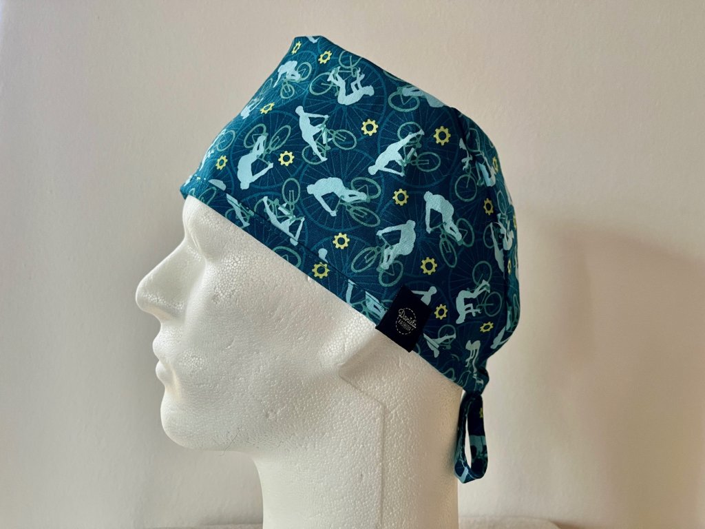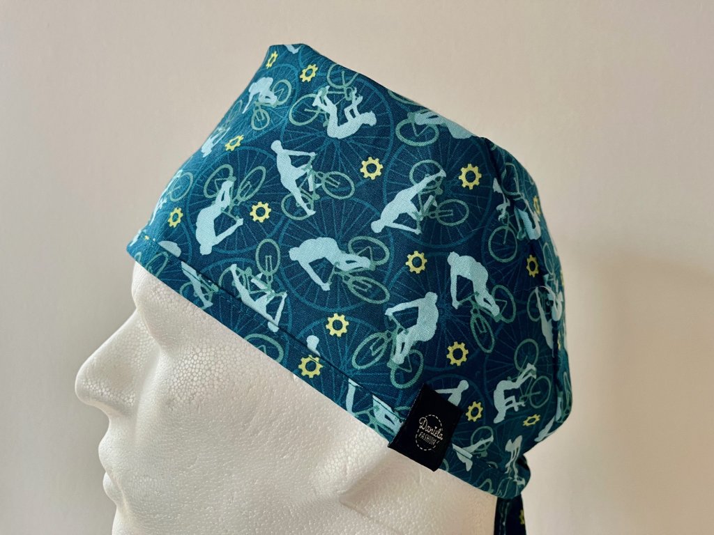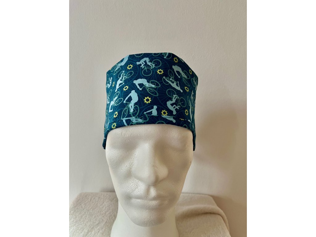 Operační čepice je vyrobena z kvalitní 100 % bavlny s motivem horských kol s jezdcem v modro-zeleném provedení.