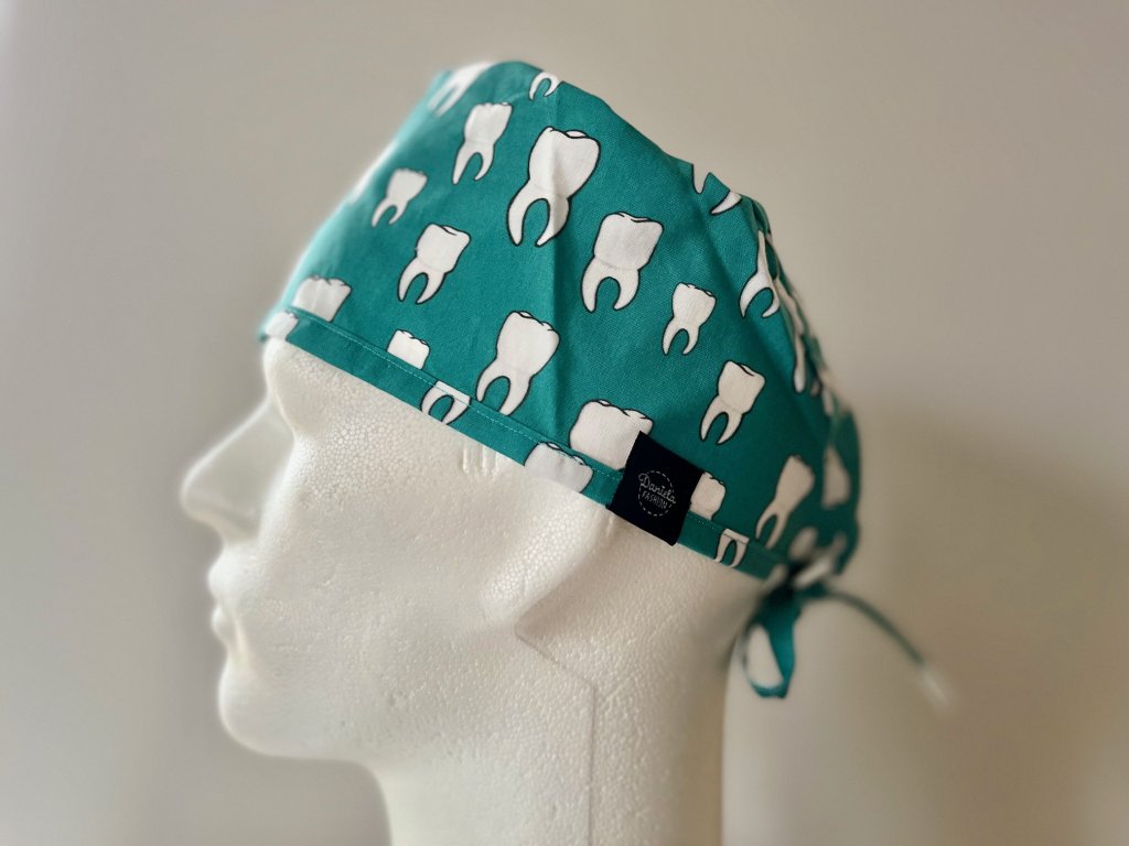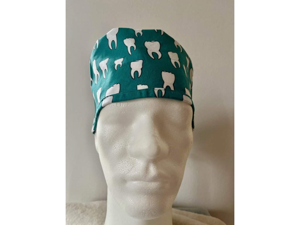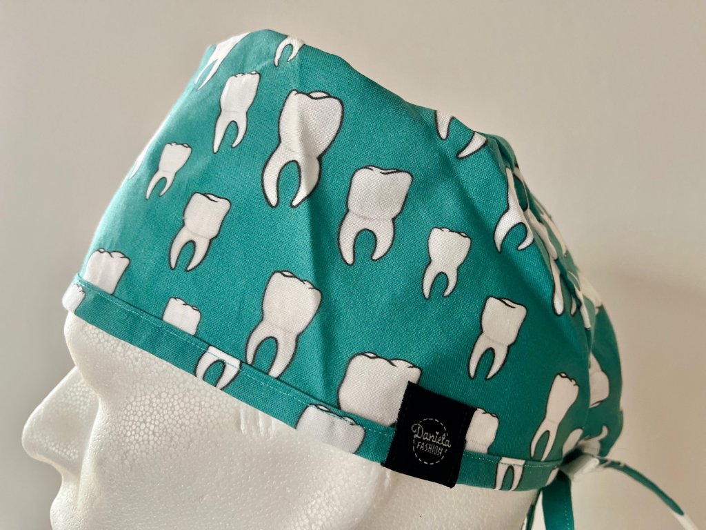 Operační čepice je vyrobena z kvalitní 100 % bavlny s motivem bílých zubů na tyrkysovém pozadí.