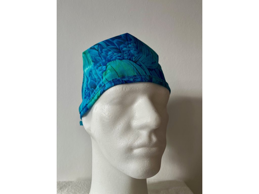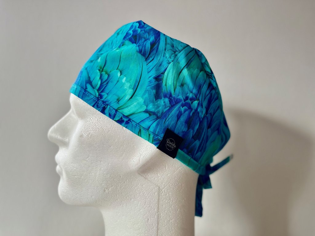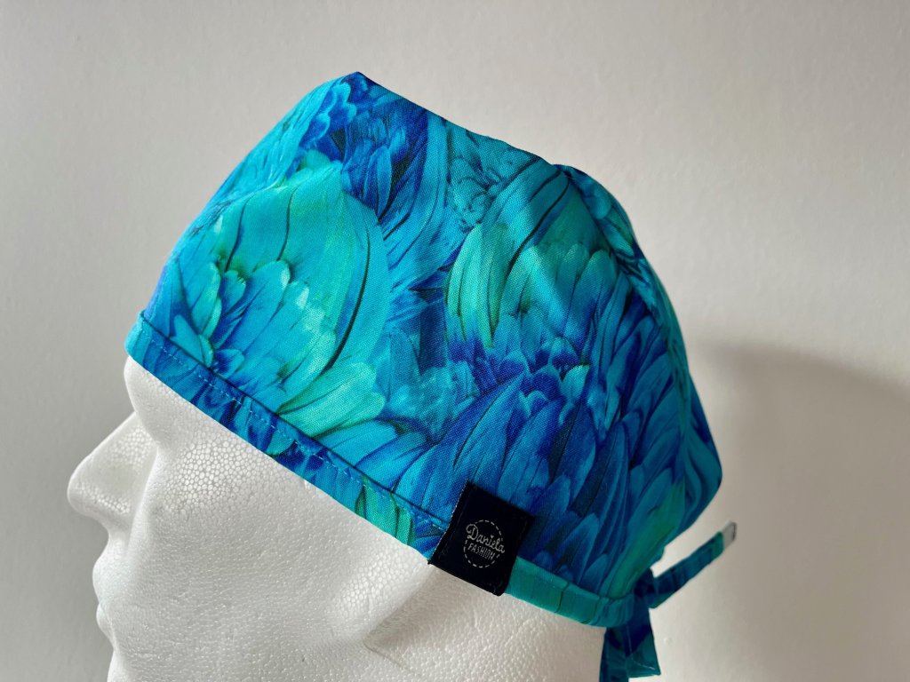 Operační čepice je vyrobena z kvalitní 100 % bavlny s motivem pírek v modrém provedení.
