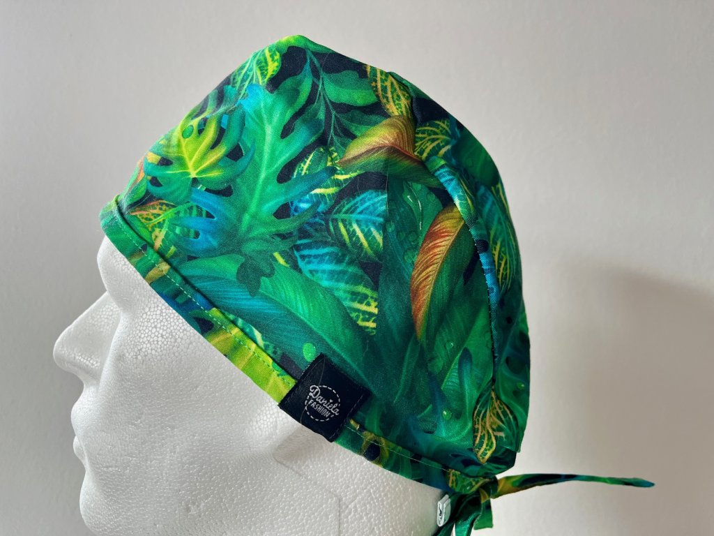 Operační čepice je vyrobena z kvalitní 100 % bavlny s motivem palmových listů v zeleno-žluté kombinaci.