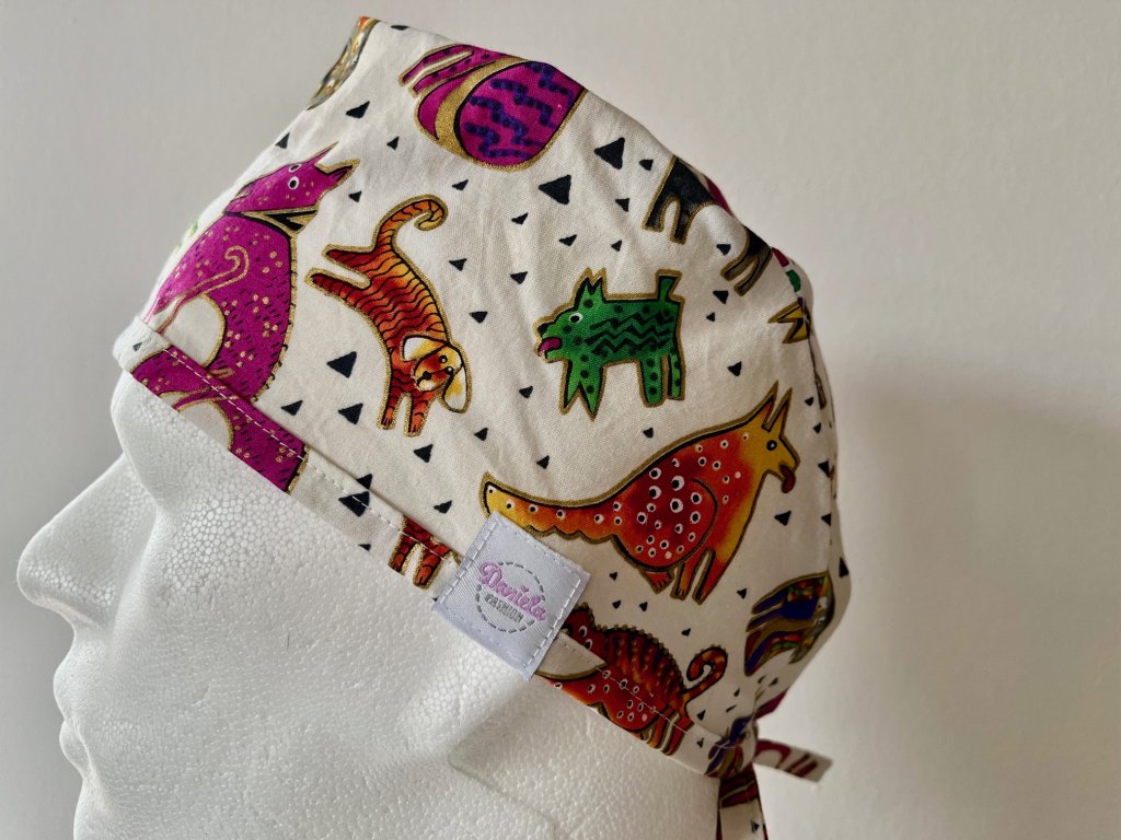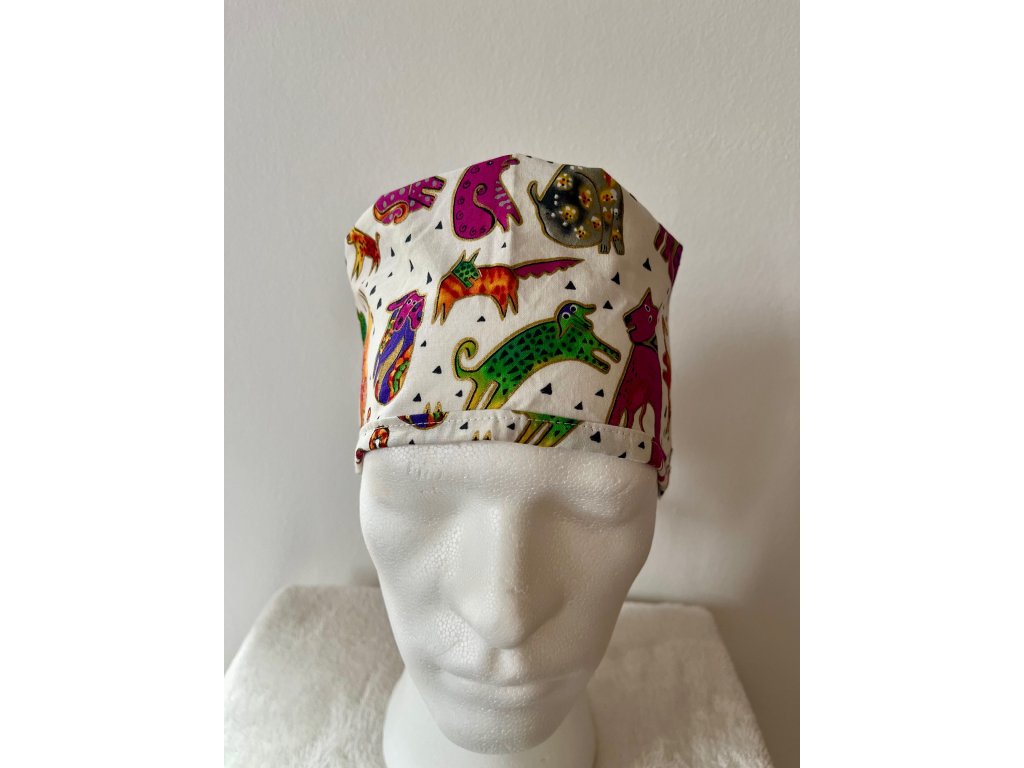 Operační čepice je vyrobena z kvalitní 100 % pevné bavlny s motivem pestrobarevných pejsků lemovaných zlatou linkou na bílém pozadí.