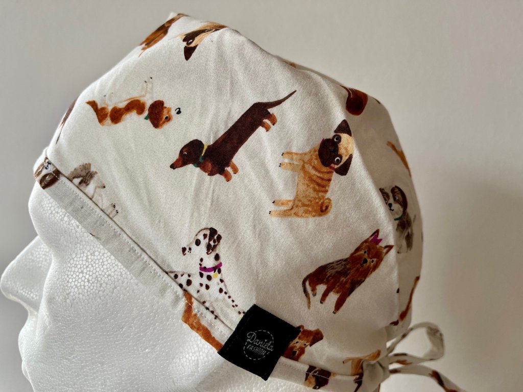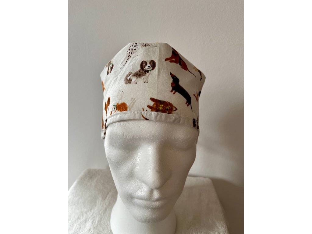 Operační čepice je vyrobena z kvalitní 100 % pevné bavlny s motivem pejsků různých ras na bílém pozadí.