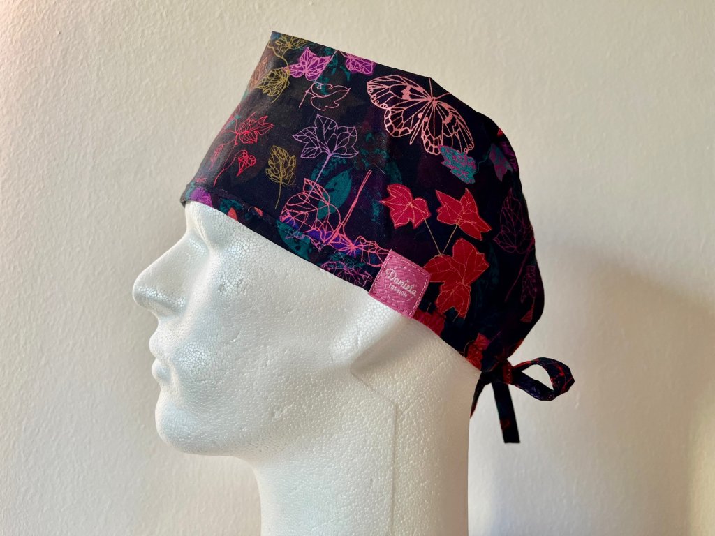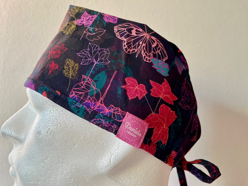 Operační čepice je vyrobena z kvalitní 100 % bavlny a na růžovo-fialovém pozadí s kontrastními listy.