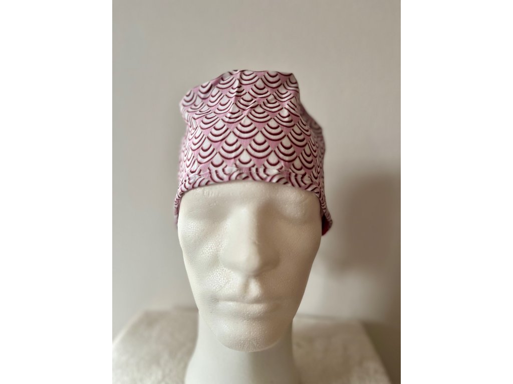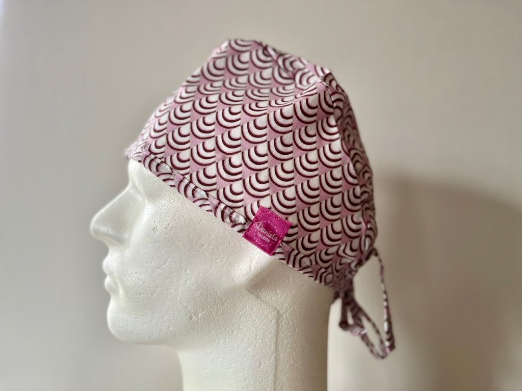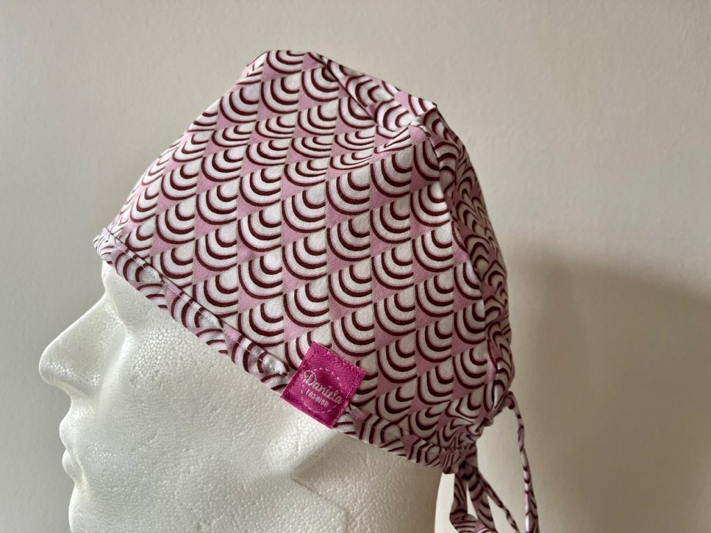 Operační čepice je vyrobena z kvalitní 100 % bavlny s motivem obloučků v růžovo-bílém provedení.