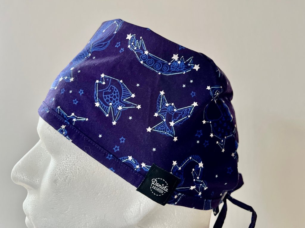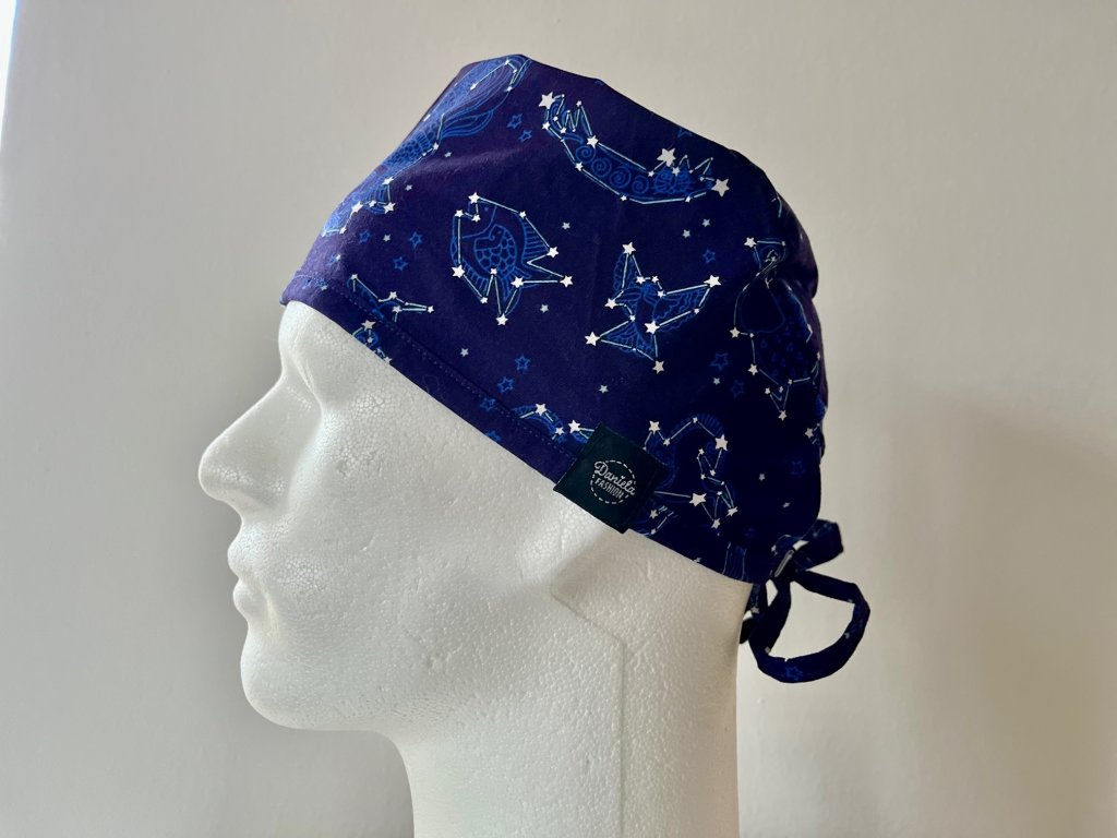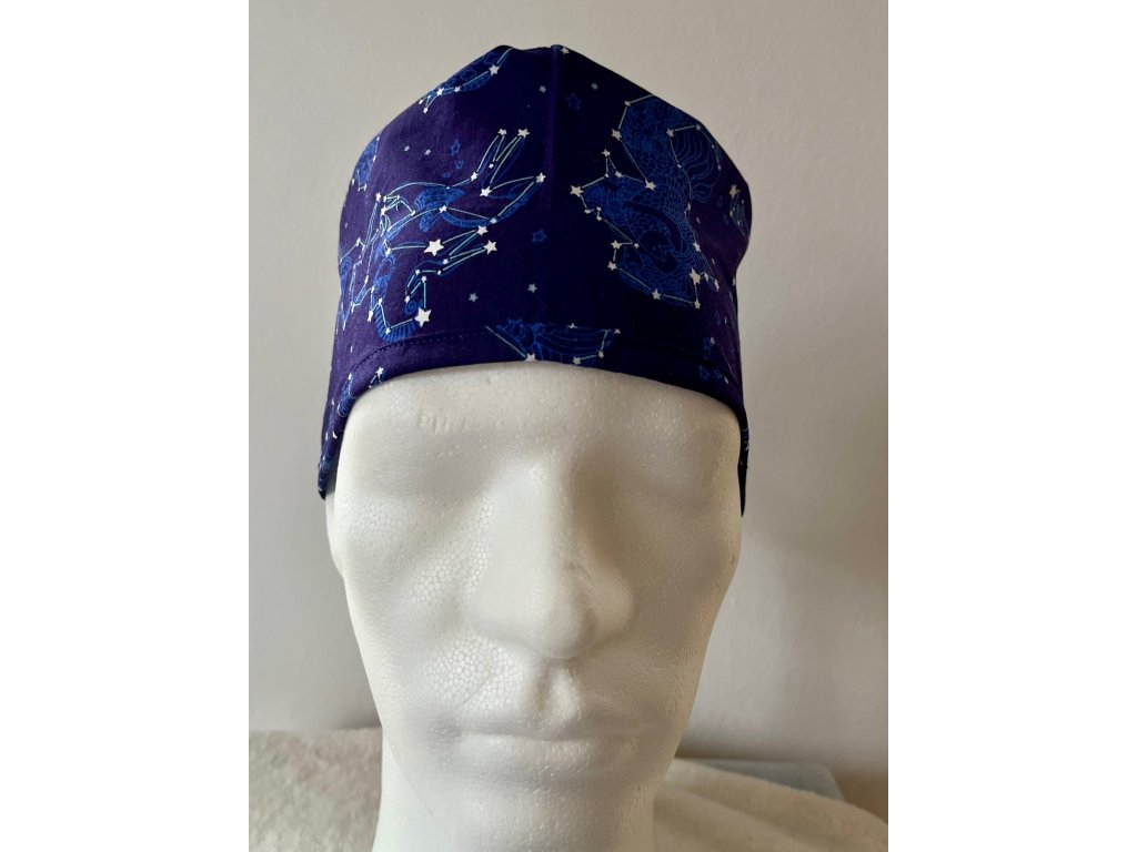 Operační čepice je vyrobena z kvalitní 100 % bavlny s motivem souhvězdí na modrém pozadí.