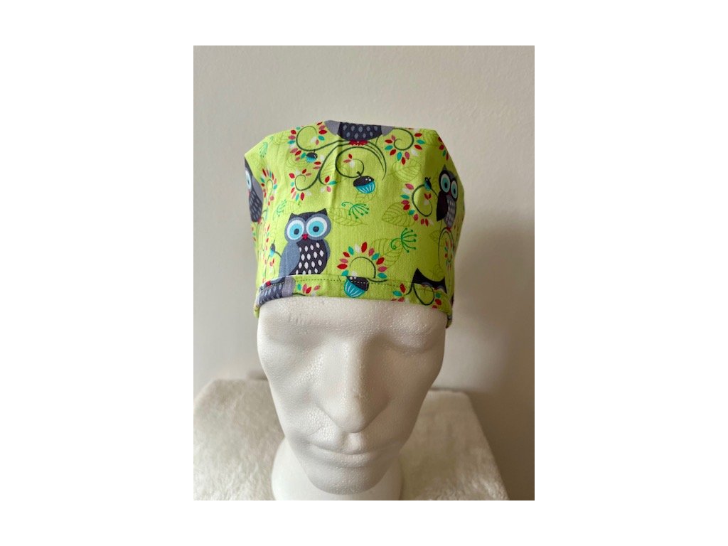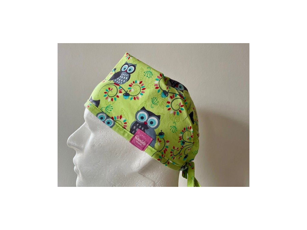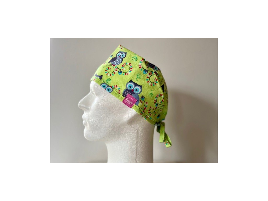 Operační čepice je vyrobena z kvalitní 100 % bavlny s motivem kreslených soviček na zářivě zeleném pozadí.