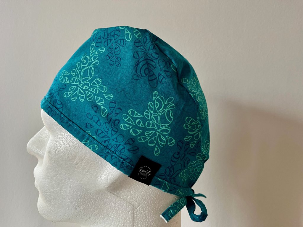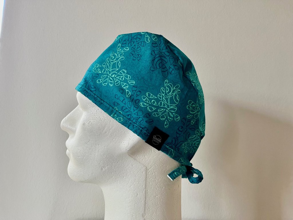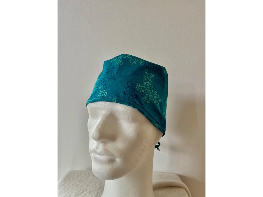 Operační čepice je vyrobena z kvalitní 100 % bavlny s motivem modrých ornamentů v tyrkysovém provedení.
