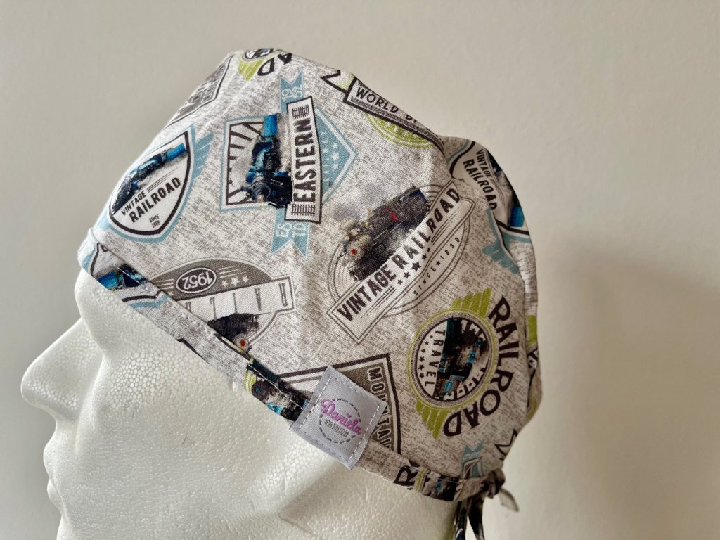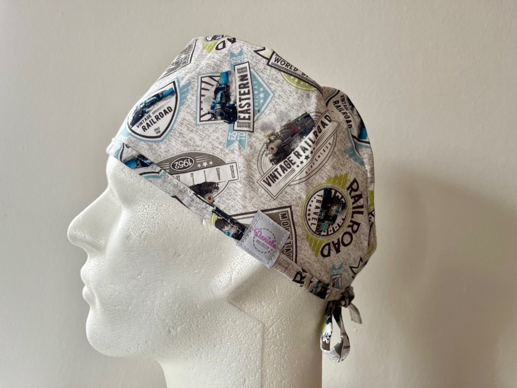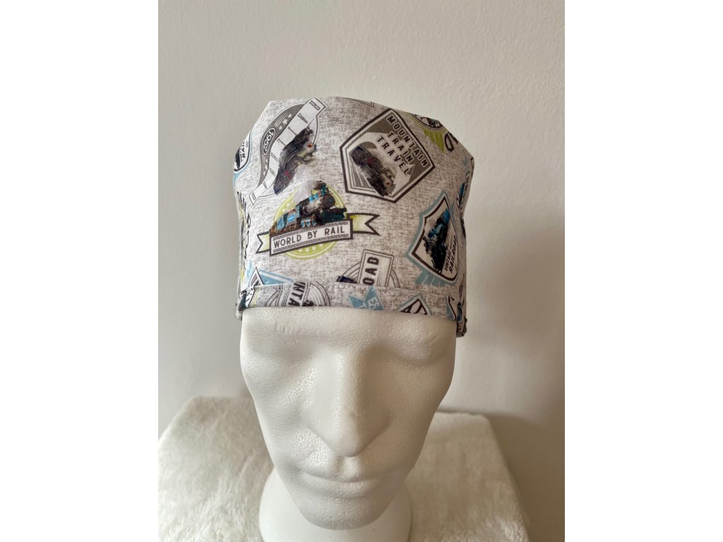 Operační čepice je vyrobena z kvalitní 100 % pevné bavlny s motivem vlaků na šedém pozadí.