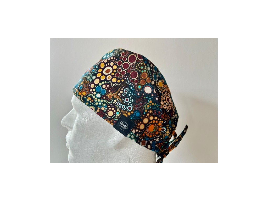 Operační čepice je vyrobena z kvalitní 100 % bavlny s motivem barevných puntíků laděné do hněda.