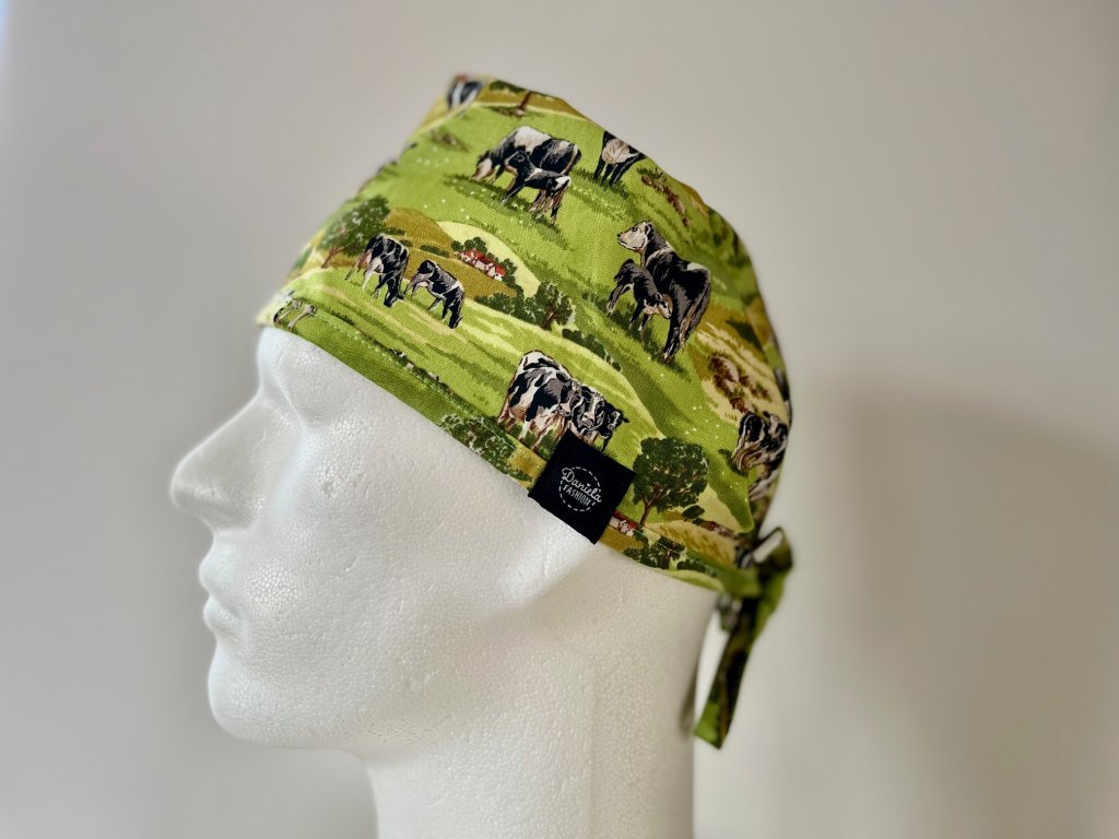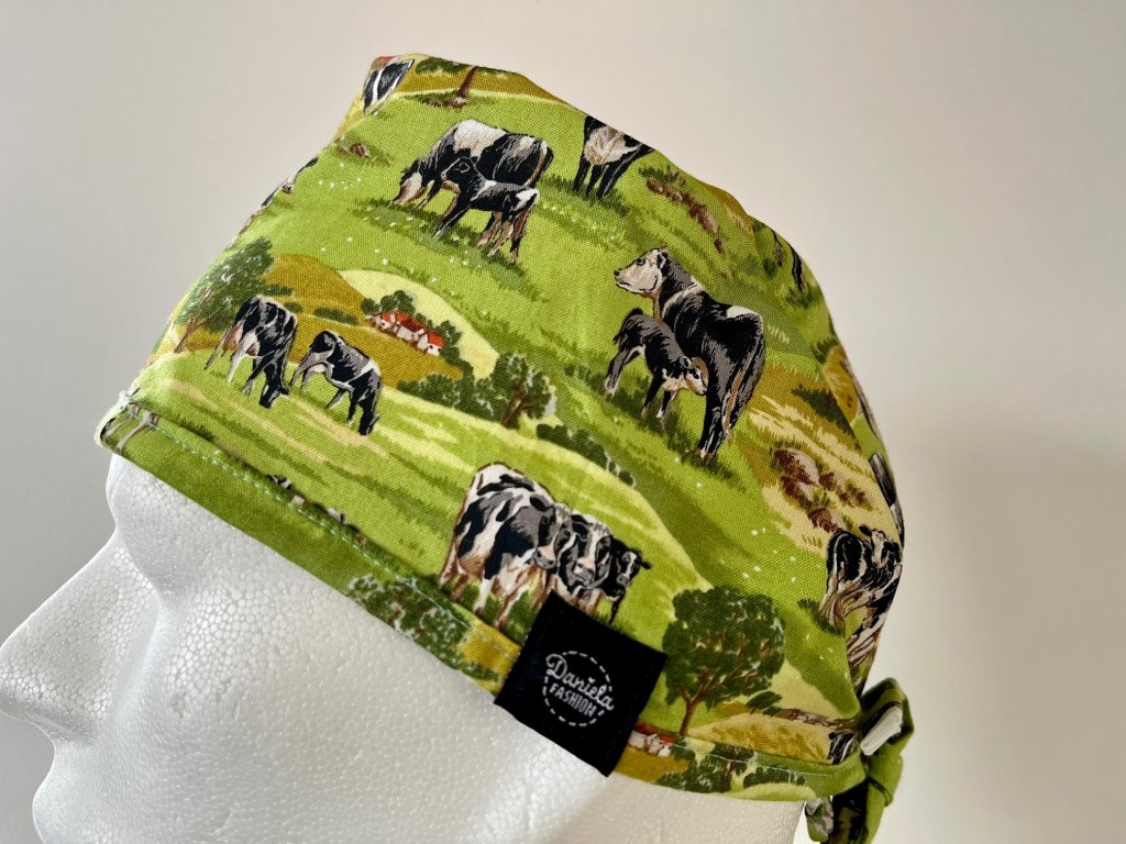 Operační čepice je vyrobena z kvalitní 100 % bavlny s motivem kraviček na zeleném pozadí.